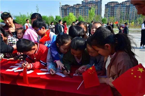 开幕仪式尾声广大读者和学生纷纷在万米长卷上签下自己的名字和喜爱的图书,以此来表达对图书的热爱。