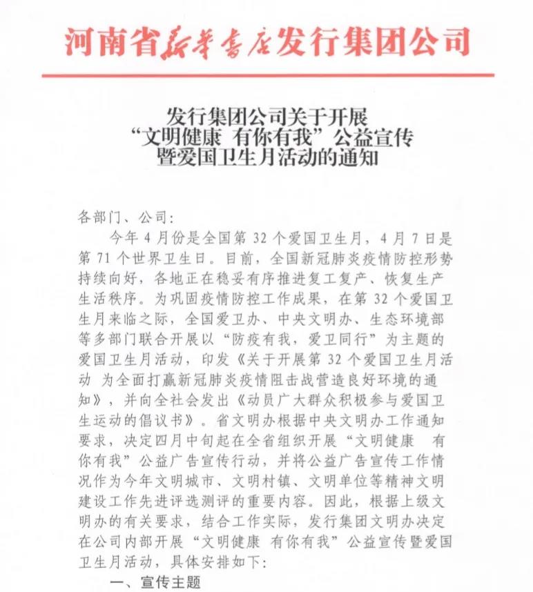 为响应郑州市委、市文明办关于深入推动《郑州市文明行为促进条例》实施,力促市民文明健康生活习惯养成,助推全国文明城市创建,不断提升城市文明程度的倡议,河南省新华书店发行集团根据上级文明办统一要求,结合本单位工作实际,开展了“做文明有礼郑州人 为文明城市添光彩”等一系列文明践行活动。