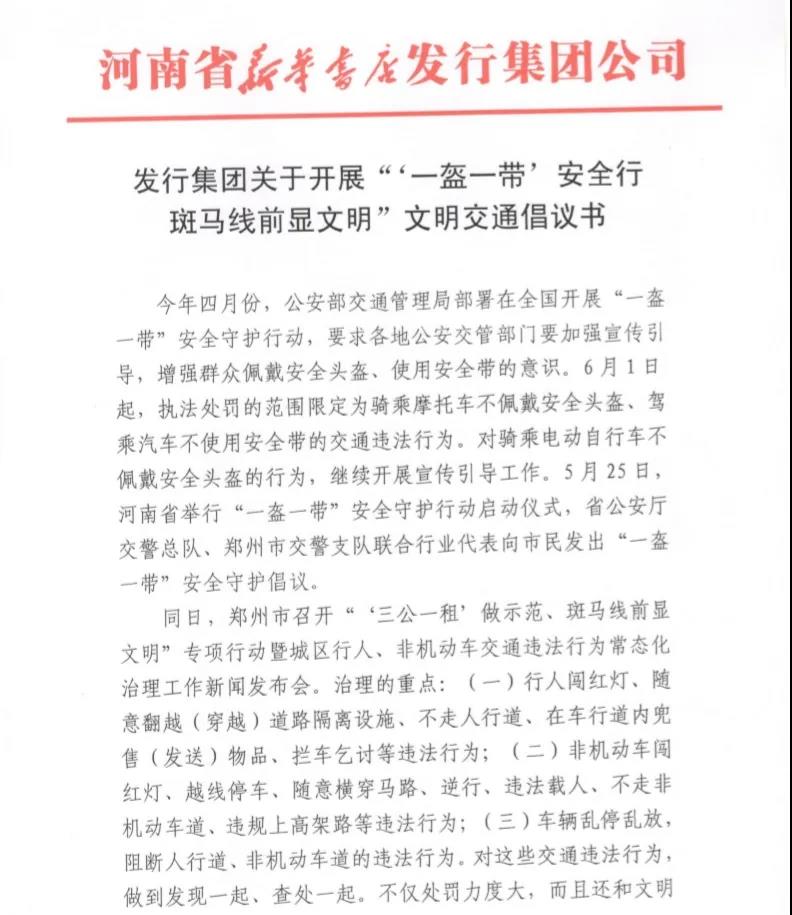 6月初,为响应公安部交管局、河南省和郑州市交通部门关于“一盔一带”安全守护倡议,发行集团发出了《关于开展“‘一盔一带’安全行 斑马线前显文明”文明交通倡议书》,一如既往积极响应并支持配合上级部门的号召和工作要求,用实际行动,影响和带动全社会广大交通参与者不断强化礼让斑马线、文明过马路的意识。