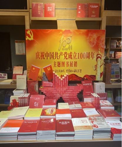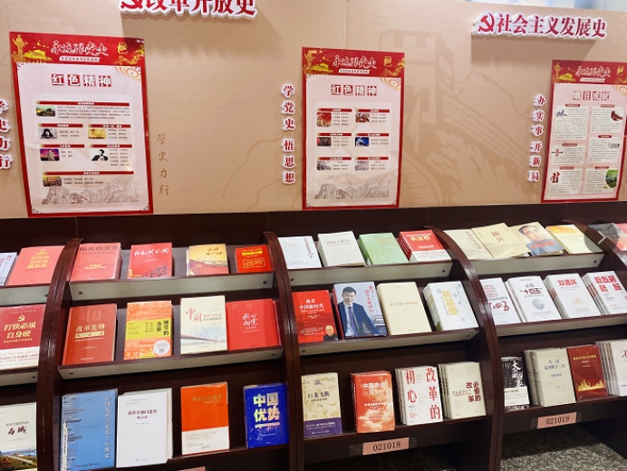 通过布置红色书籍展台,设置党史学习教育系列读物展示专区,党史类书籍达一千多种。第一时间重点宣传陈列了《论中国共产党历史》等重点学习读物,并设立了中国共产党史、新中国史等“四史”图书的专题展区。