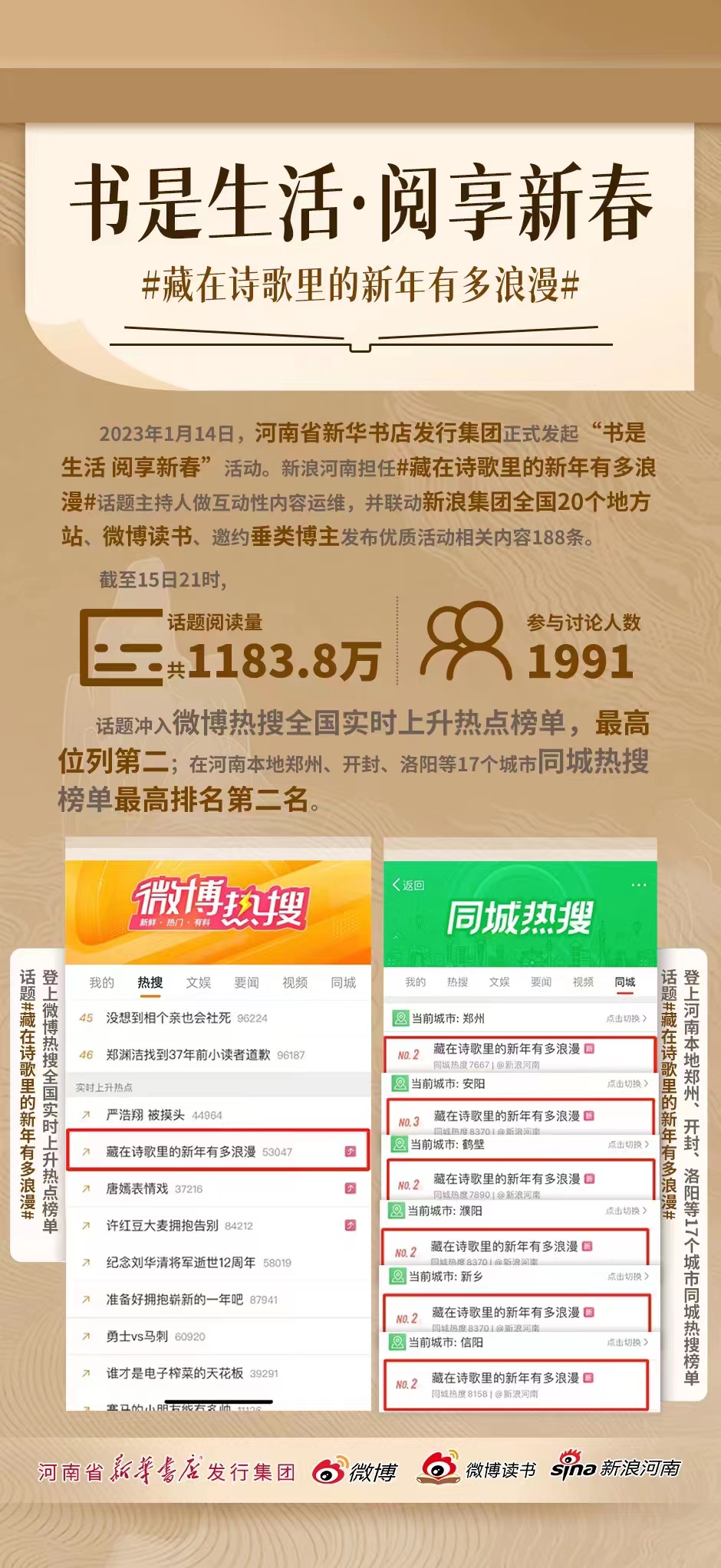 《百家讲坛》主讲教授王士祥、豫教音像社总编辑张瑞芳、朗诵名家肖洒等大咖做客尚书房海汇港店,把书香带入年味儿,让我们的节日更加有文化厚度,当天活动微博话题获得全网970万阅读,精彩的活动内容让线上线下的广大读者纷纷点赞,跃居全国实时榜和同城热搜榜第2位。至此,“诗词里的年味儿”活动拉开了河南新华书店新春阅读推广序幕。