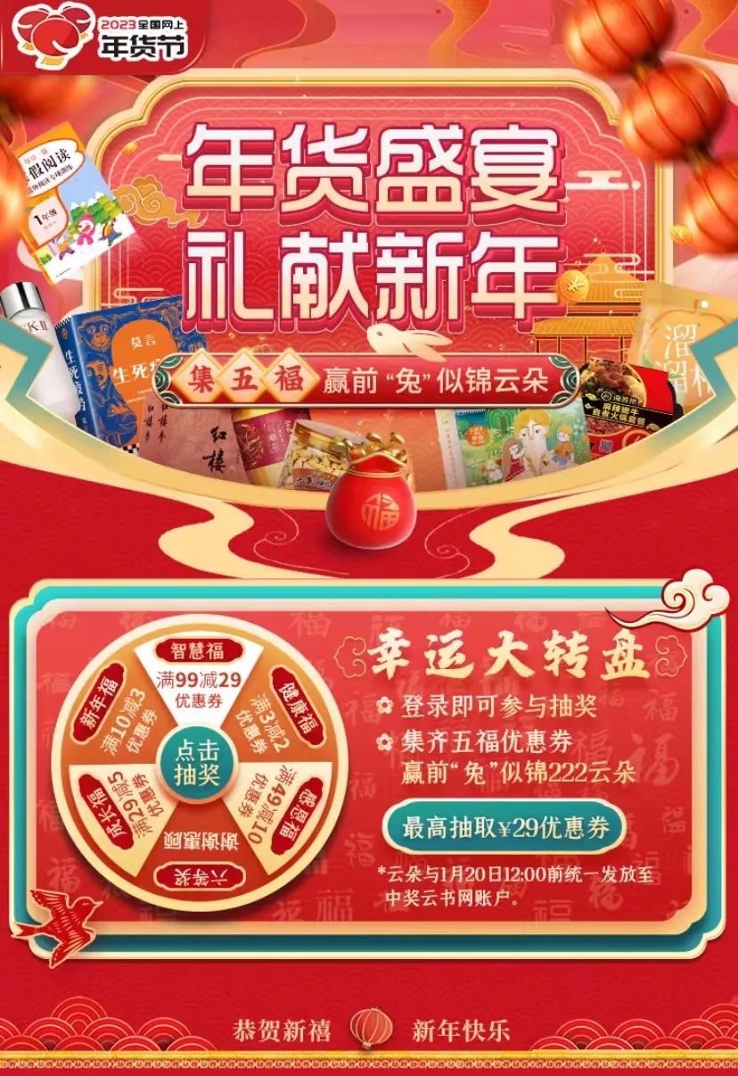 读者还可参与云书网线上商城“集五福”得前“兔”似锦222云朵营销活动;还有新年礼遇新人、红包文创用品买1赠1等线上线下活动,更有超多图书折扣,优惠券等你拿。1月25日-1月27日,云书网将开展“新春读好书,文化过大年”直播带货活动,关注“河南新华书店直播间”,每天精彩直播为你推荐正版福利好书,与主播互动可享更多优惠哦。