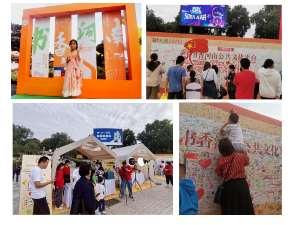 在活动主会场郑州市紫荆山公园,公益捐赠、图书交换、非遗文创、爱国弹幕、诗词打卡、藏书票集章等互动体验活动打卡超1万人次,现场游览书展7.3万人次,线上平台浏览互动超2000万人次。活动中,书香河南公共文化平台得到有效推广,新增用户12156人,总用户量7.18万,浏览量84万次。