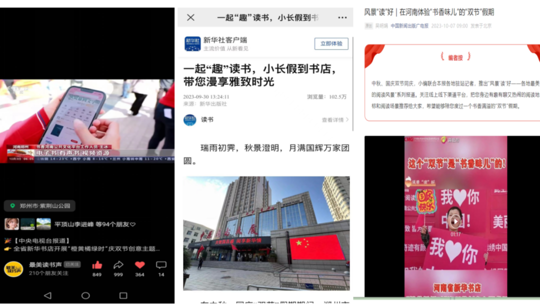 活动期间,各地新华书店协同发力,通过体验式、沉浸式、互动式的文化表达形式,将线上线下充分融合,吸引众多媒体争相报道。9月30日,新华社客户端以“一起‘趣’读书,小长假到书店带您漫享雅致时光”为题进行报道;10月2日,#国庆的河南是书香味儿的#等活动相关话题登上微博热搜,阅读量突破240万次;10月3日,中央电视台新闻频道对整体活动进行重点报道。此外,学习强国、中国新闻出版广电报、河南日报、河南电视台、文旅中国、顶端新闻、今日头条等权威媒体平台共同聚焦报道,线上话题浏览量达到707.3万次,全平台总浏览量超2000万次,有力实现了书香河南全民阅读品牌的破圈传播。