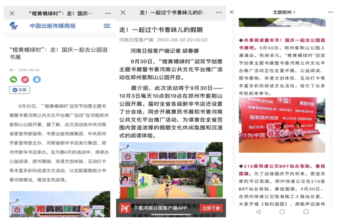 在刚刚结束的“双节”8天小长假中,由省委宣传部指导,中原出版传媒集团主办,河南省新华书店发行集团、全省各级新华书店联动承办的“橙黄橘绿时”迎双节创意主题书展暨书香河南公共文化平台推广活动,在全省市、县(区)文化地标处圆满举办。528场次的惠民书展、创意阅读、潮流文旅、诵经典、拆盲盒、手工制作等缤纷活动,深受人民群众喜爱。
