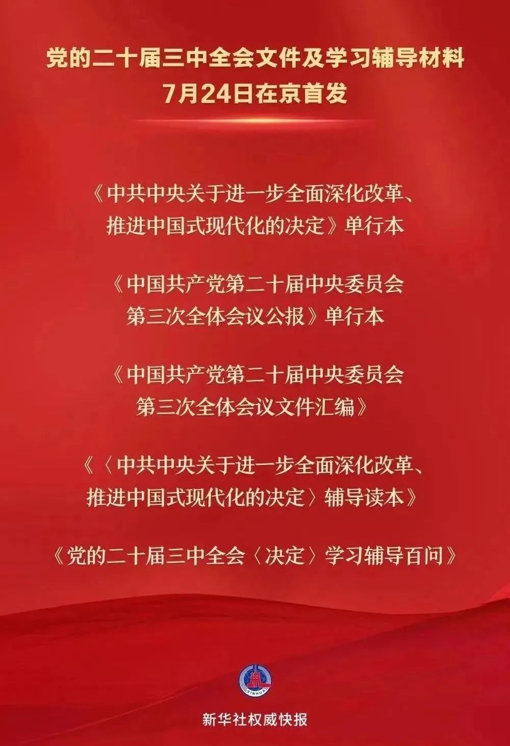 党的二十届三中全会是在以中国式现代化全面推进强国建设、民族复兴伟业的关键时期召开的一次十分重要的会议。全会文件及学习辅导材料7月24日在京首发。由人民出版社、党建读物出版社、学习出版社共同推出的5种大会文件及学习辅导材料与读者见面,为全国广大党员干部群众深入学习贯彻党的二十届三中全会精神提供了权威准确的读本。