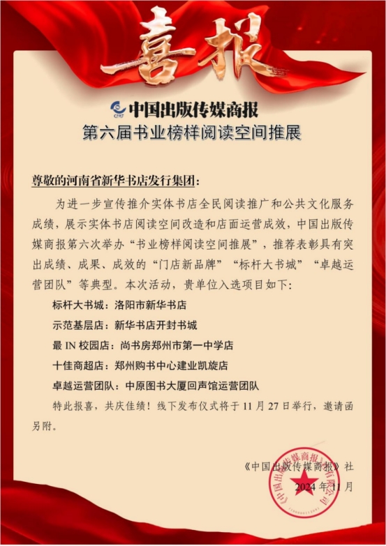 11月27日,由中国新华书店协会与中国出版传媒商报联合举办的“第六届书业榜样阅读空间推展”发布活动于山西太原圆满落幕。本次活动揭晓了包括“卓越运营团队”“十大门店新品牌”“标杆大书城”“示范基层店”“格调社区店”“十佳商超店”以及“最IN校园店”在内的七项推选结果,全面展示了书业领域的最新发展成就,并吸引了业界的广泛关注。在此次推展活动中,河南省新华书店发行集团表现优异,一举斩获五个奖项。