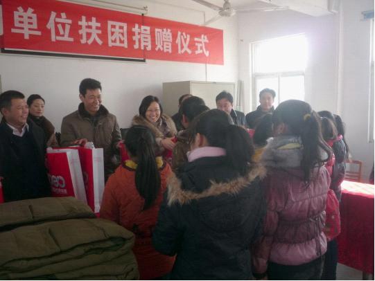 2012年12月31日,在新年即将之际,中共泌阳县委组织部部长和宣传部副部长带领由泌阳县国税局、泌阳县店、移动公司三家组成的文明单位扶困捐赠小组,前往泌阳县高邑乡,对留守儿童进行了扶困捐赠活动。严寒冬天,温情融融,扶困小组把几十套棉衣、棉被和127册《新华字典》亲自送到留守儿童的手中,让留守贫困儿童深深感受到春天般的温暖。