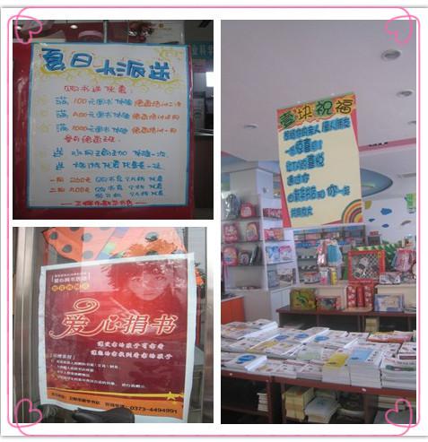 夏季已经进入中伏天气,火热的太阳焦灼着城市的每一个角落,为给读者们一个清新的读书环境,卫辉市店多措并举,积极开展了多种精彩活动。一是开展捐赠图书、传递爱心活动,希望广大读者加入新华爱心队伍,尽我们的微薄之力,帮助那些家境贫寒、身残志坚的孩子们达成读书的心愿。二是开展图书展销活动,为引导广大青少年多读书、读好书,该店举办“2013年暑期青少年重点推荐读物”主题展销活动,所有推荐图书为该店精选图书系列。三是开展图书打折活动(7月10日—8月31日):“关爱一夏、祝您金榜题名”,凡2013年中考、高考毕业生,凭本人准考证购书均可享受全场图书及音像制品九折优惠。 四是“新华清凉夜市”—限时打折:书店的九折不是只为学生打折,为了确保大家都可以购买便宜正版的图书和音像制品,该店推出限时营销方针,也为回馈广大读者的厚爱,每周二、四晚18:30——19:30,全场图书及音像制品九折优惠。