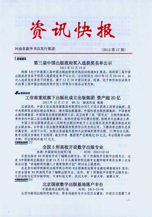 来源:河南省新华书店发行集团有限公司  作者:河南省新华书店发行集团有限公司  发布时间:2013/12/23 12:32:11  阅读次数:8196