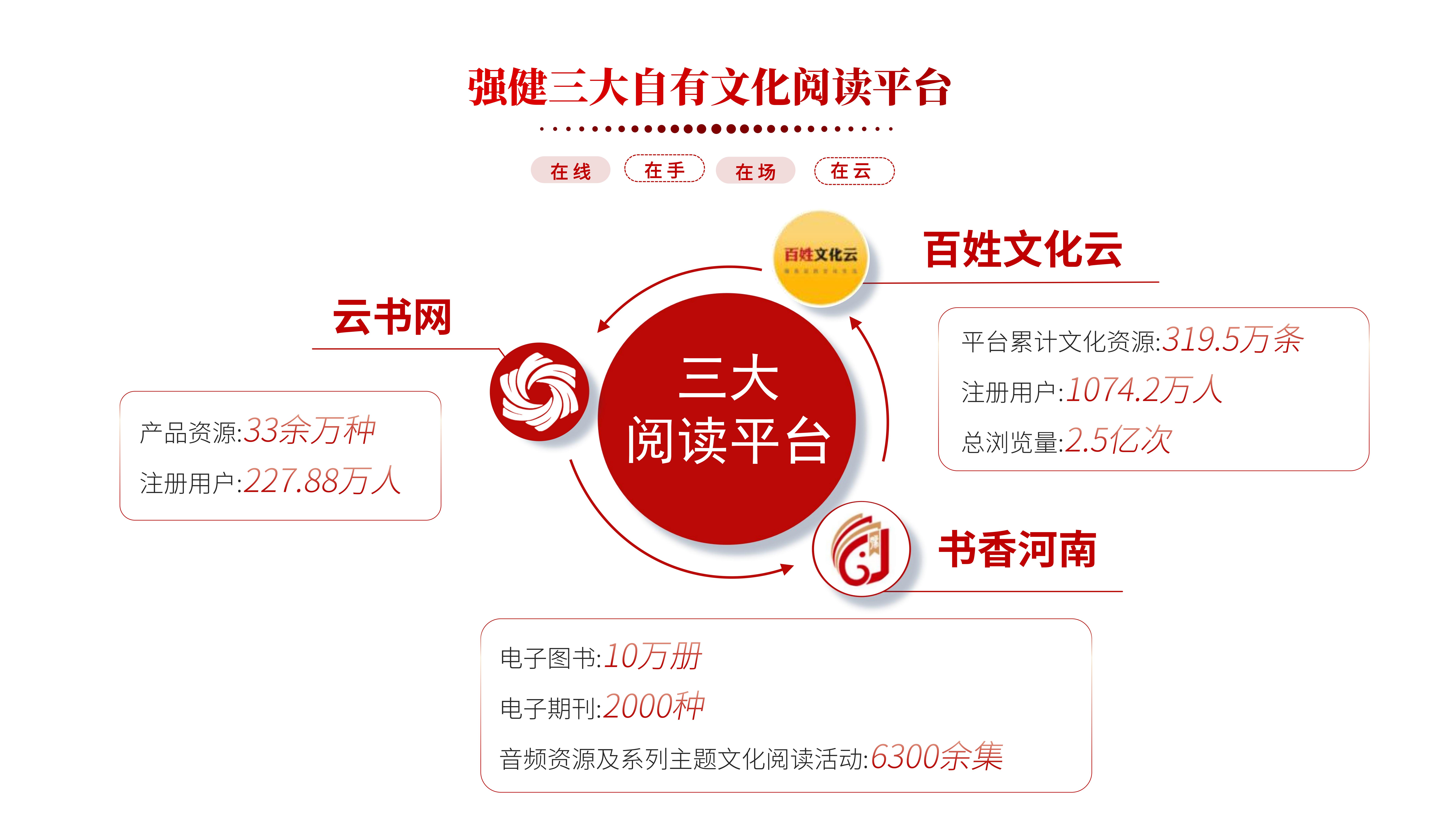 河南省新华书店紧贴人民群众线上需求,主动顺应数字经济发展方向与新时期阅读潮流,坚持以互联网思维构建融媒阅读传播矩阵,布局搭建了云书网、百姓文化云、书香河南公共文化平台,以及各类阅读社群、直播矩阵、短视频等融媒矩阵平台,形成了“在线、在手、在场、在云”阅读体系,持续完善构建线上线下融合互动、立体覆盖的文化服务供给体系,倾力为人民群众提供多端触达、全域全景的线上阅读服务。
